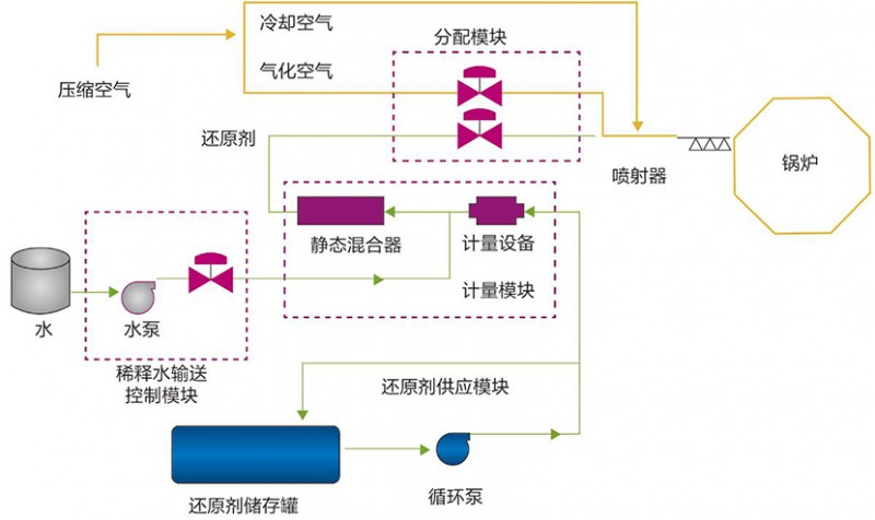 選擇性非催化還原法(Selective Non-Catalytic Reduction,簡稱SNCR),是在不需要催化劑的情況下,將氨基還原劑(尿素/氨水)噴入溫度為850~1150℃的煙氣中,還原劑有選擇性地與煙氣中的氮氧化物發生化學反應,使NOx還原生成N2和H2O的方法。
